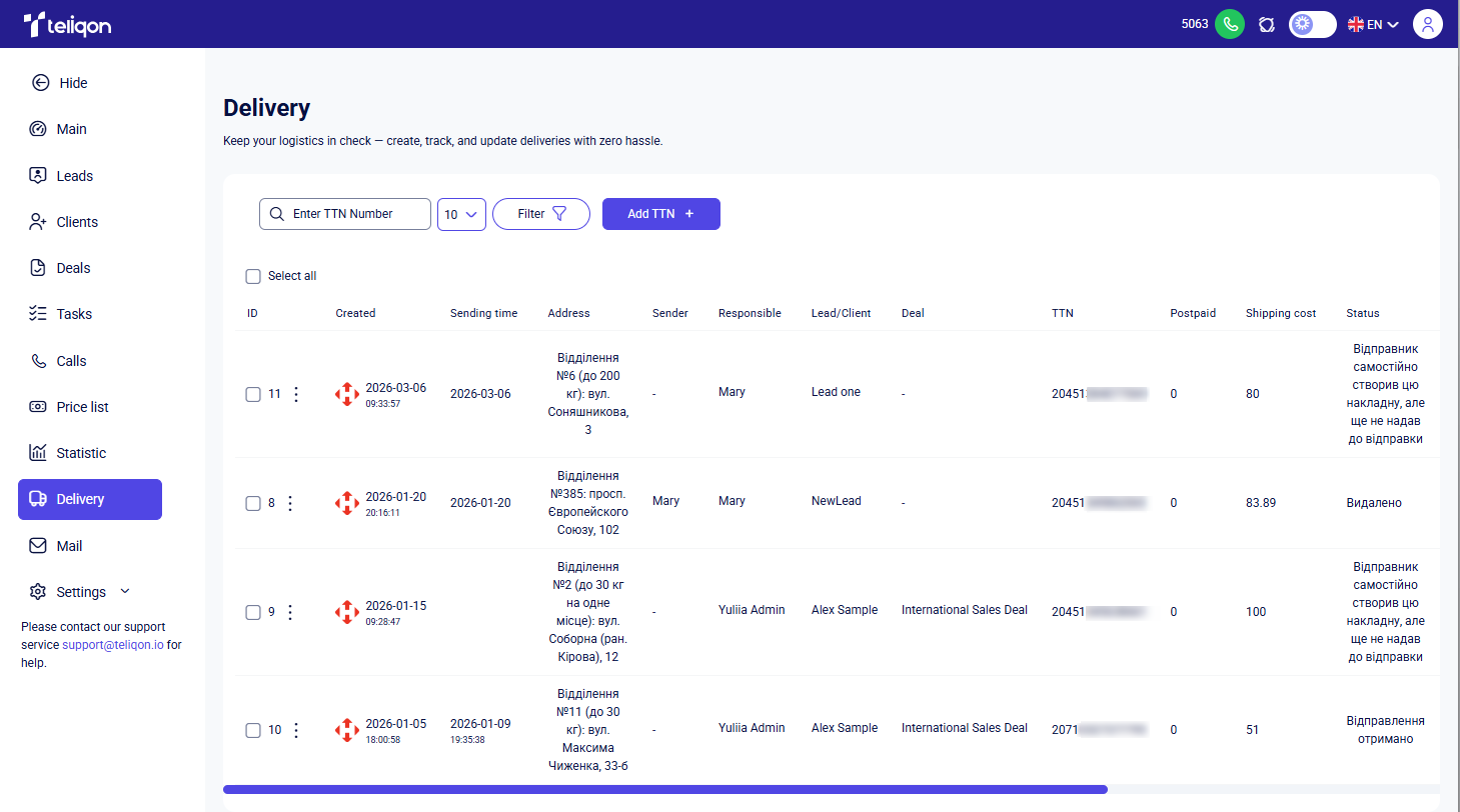 This document describes the Delivery section in Teliqon CRM and explains how shipment records are viewed and managed. It covers TTN handling, search, filtering, bulk actions, and the delivery parameters shown in the main table.