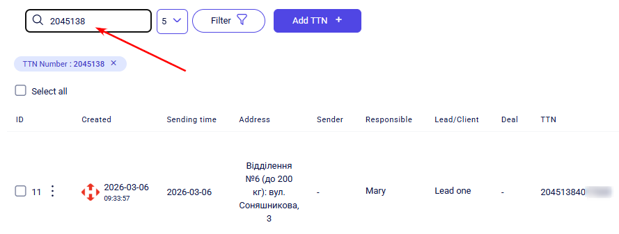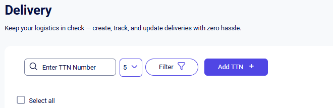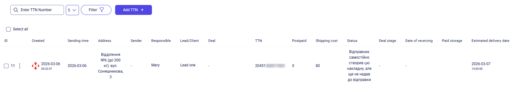 Once all required fields are completed, click Add. The TTN will then be displayed in the general list of the Delivery section.