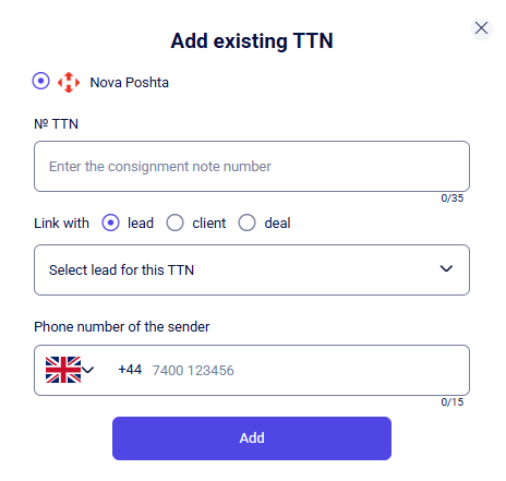 After clicking the Add TTN + button, a pop-up window will open where you can add an already existing Nova Poshta TTN: