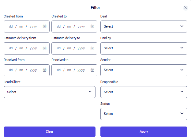 All other parameters for filtering delivery information can be configured using dropdown lists.