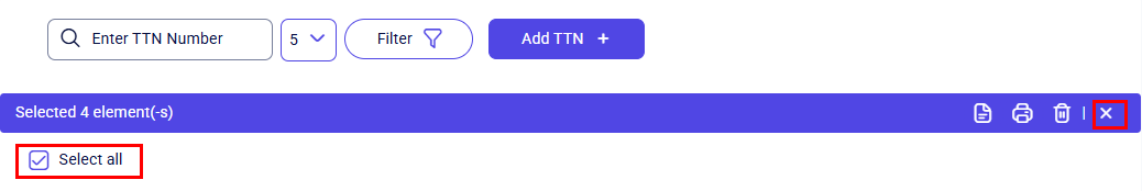 To cancel the bulk selection of tracking numbers, click the Select all checkbox again or click the X on the bulk actions toolbar.