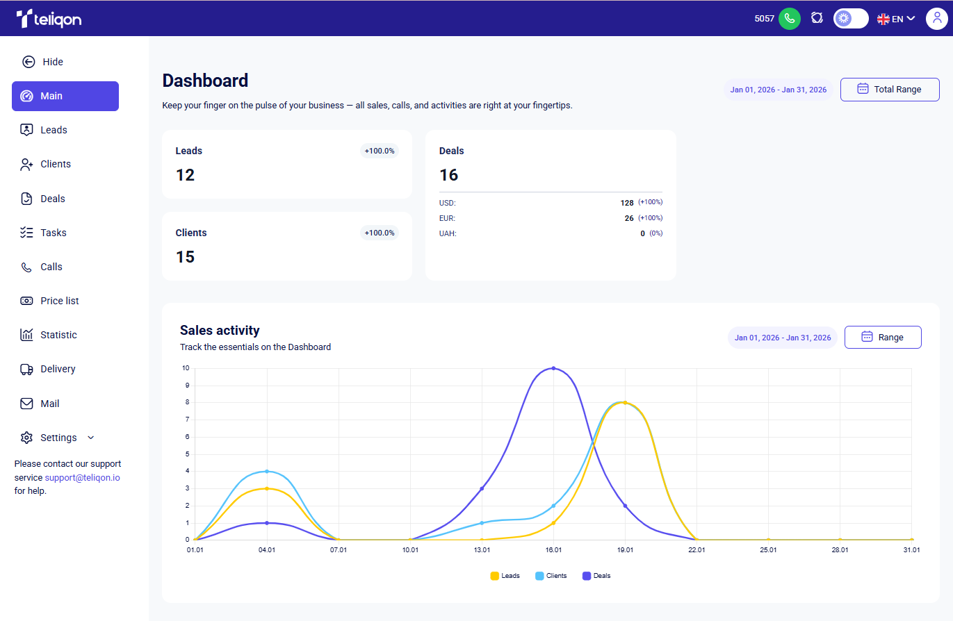 This document describes the Main dashboard in Teliqon CRM and explains the statistical charts available on the page. It covers how to configure date ranges for all charts and how to work with Sales activity, Activity distribution, and Calls count widgets.