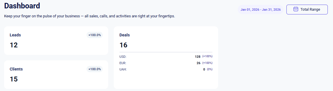 Track the total count of leads, clients, and deals within the system: