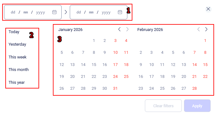 If you wish to reset the selected parameters while choosing a time period in the calendar, click the Clear filters button.
