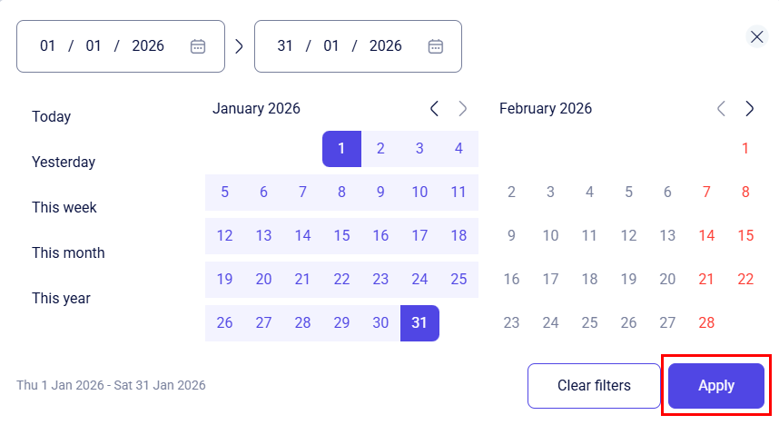 After making your selection, click the Apply button to save and apply the chosen date range.