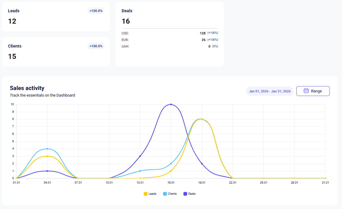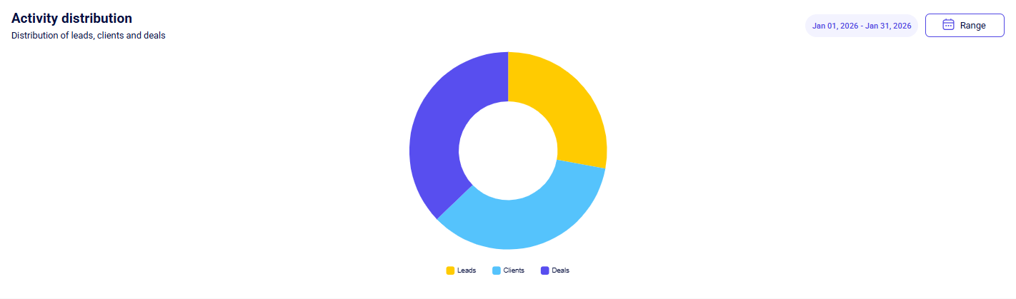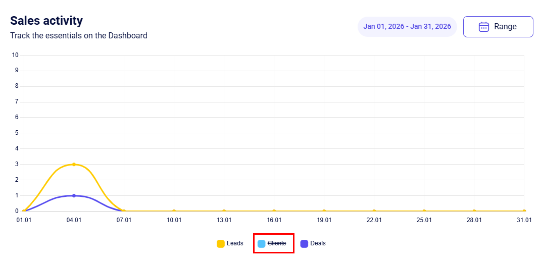 Additionally, the total number of leads, clients, and deals is displayed above the chart.