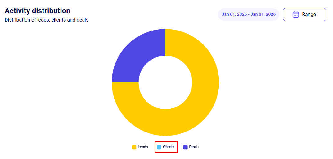 By default, all entities (leads, clients, and deals) are selected, but you can hide any you don't need from the pie chart. To do this, click on the entity type you want to hide: