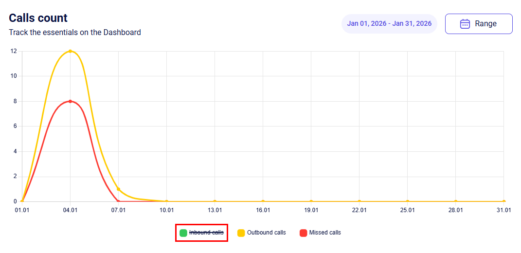 The Calls count chart, in addition to the calendar, includes an extra configuration parameter - the call type to be displayed on the chart.