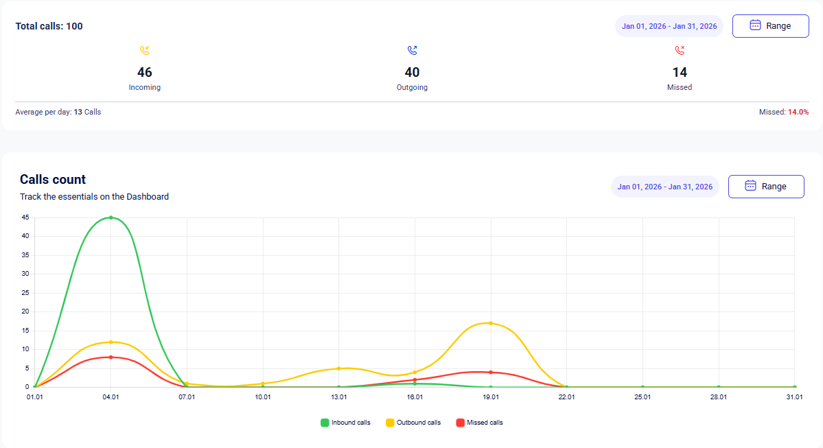 Track the number of incoming, outgoing, and missed calls using filters:
