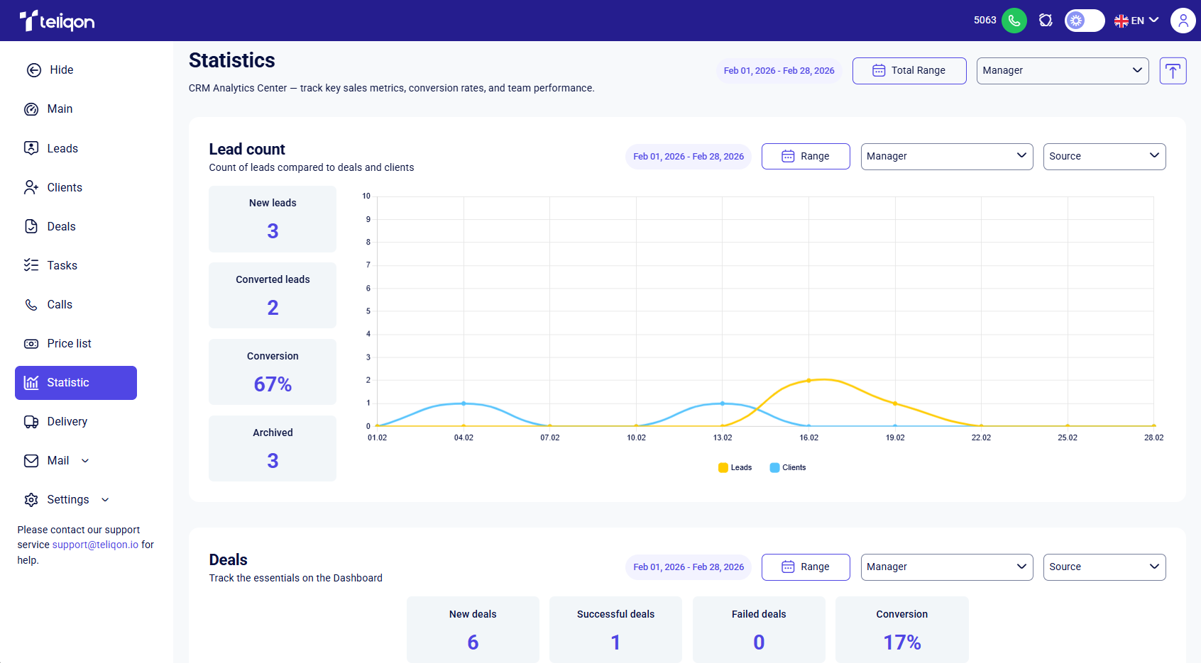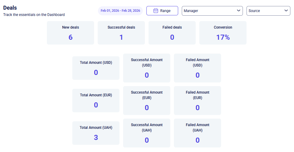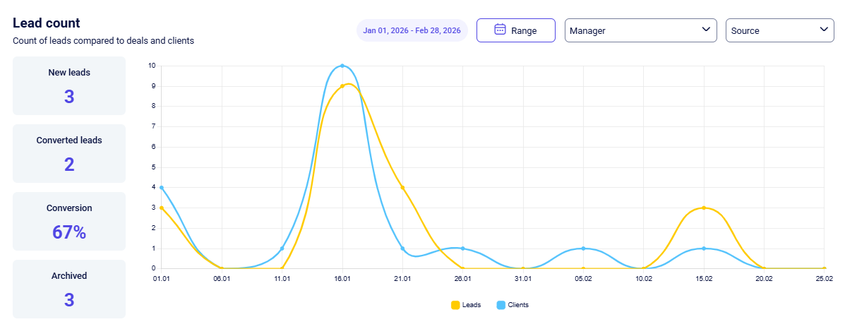 The Range, Manager, and Source filters function consistently across the system. They enable segmented analysis by timeframe, staff member, or acquisition source, and can be applied in combination for deep-dive reporting.