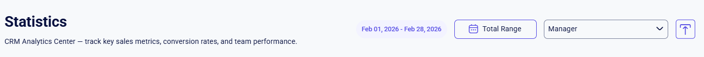 - Total Range button: enables users to define a specific date range for the entire analytics dashboard. While the calendar interface operates similarly to the Lead count section, this setting applies changes globally across all visual data, whereas the standard Range button only modifies individual charts.