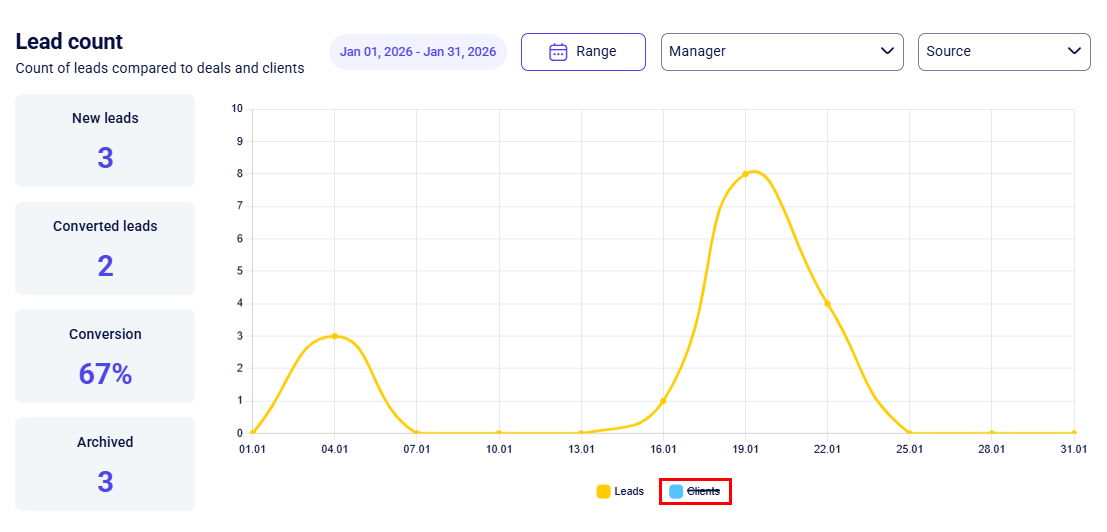 - Converted leads - the number of leads that have been successfully transitioned to client status.