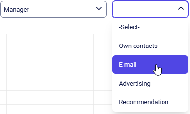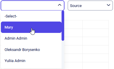 Source dropdown menu - use this filter to view statistics broken down by customer acquisition channels. Select a specific source from the list, and the system will display data only for those leads or deals that originated from that channel.