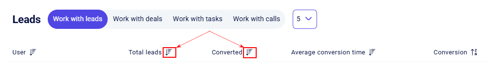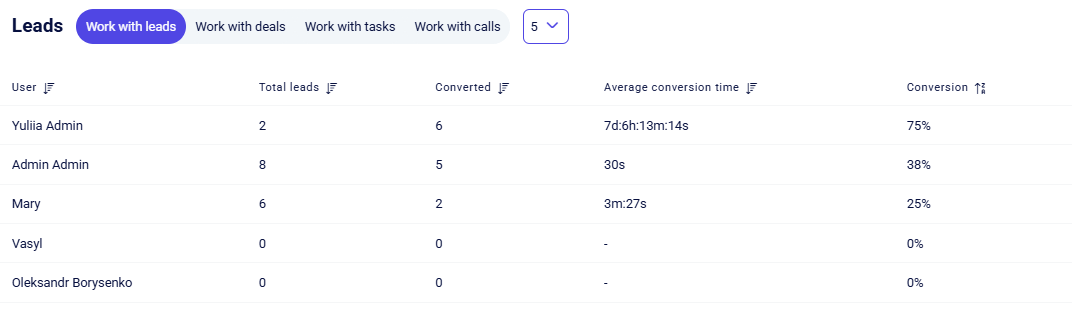 - Work with leads - tracks manager activity regarding new inquiries, including the total number of leads received, the count of converted contacts, conversion rate, and average conversion time.