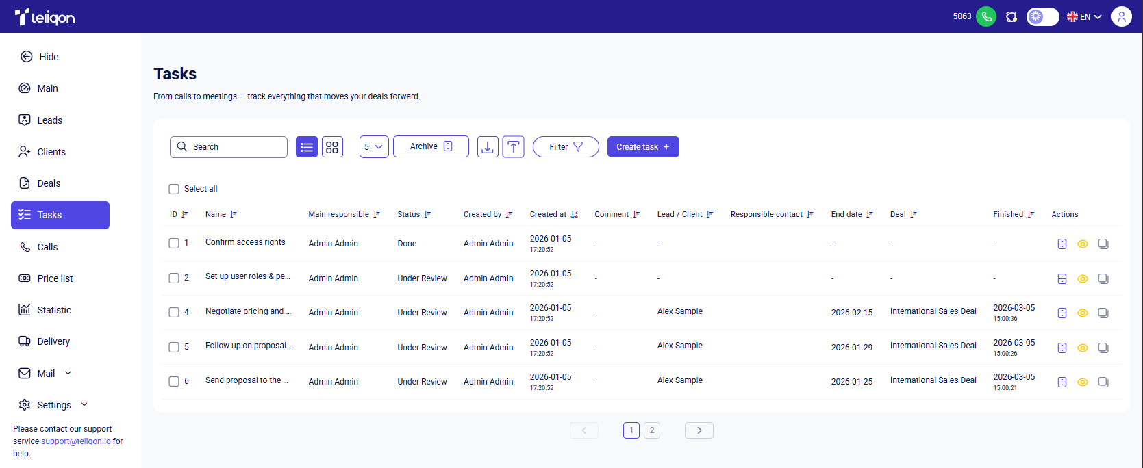 This guide explains how to view, filter, and manage call records in the Teliqon CRM system. It describes the Calls page interface, including the toolbar, quick filters, call playback, and bulk actions. The document also explains how to create leads or deals directly from call records.