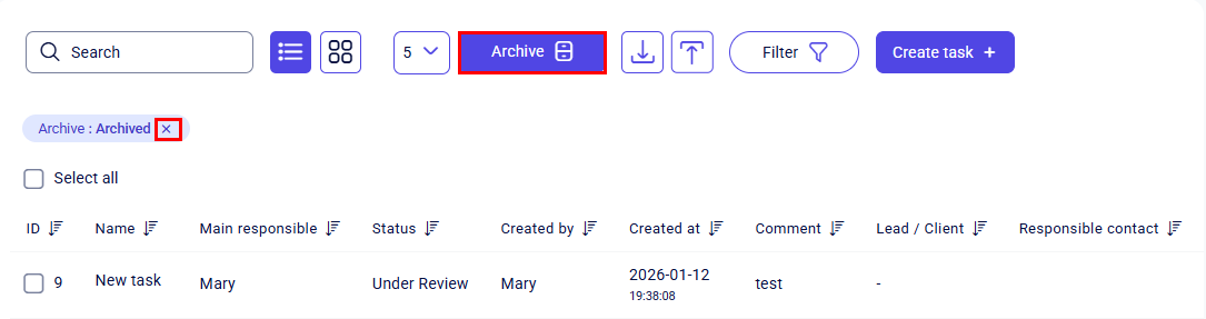 The first click on this button takes you to the archived tasks. To return to the active tasks, simply click the button again or click the X next to the newly created filter.