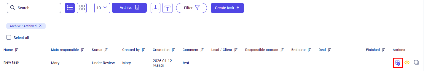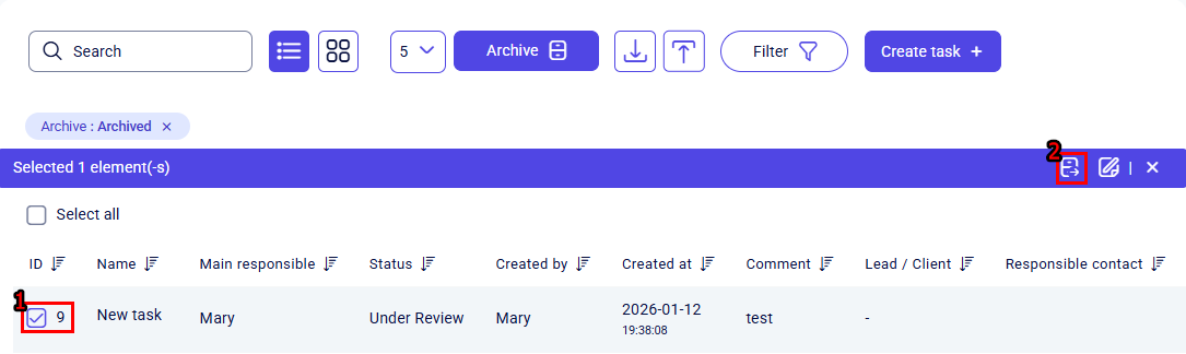To return a task from the archive to the active list, select it using the checkbox and click Unarchive on the bulk actions toolbar.