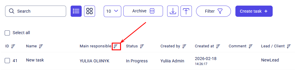 The search bar provides a convenient way to search for tasks by full or partial matches in any task field. To use it, simply click on the bar and start typing — the search begins automatically as soon as you enter the first characters.