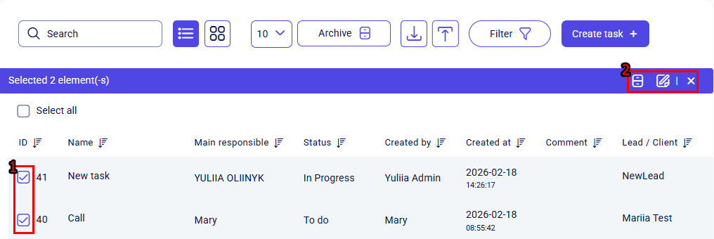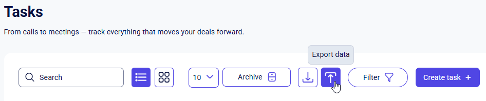 This button is used to bulk-move selected tasks into the archived state. They will not disappear from Teliqon CRM but will move to the archived tasks page. Instructions on how to access the archived tasks page can be found in this section. -