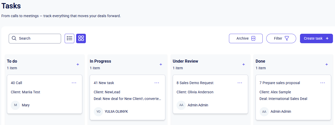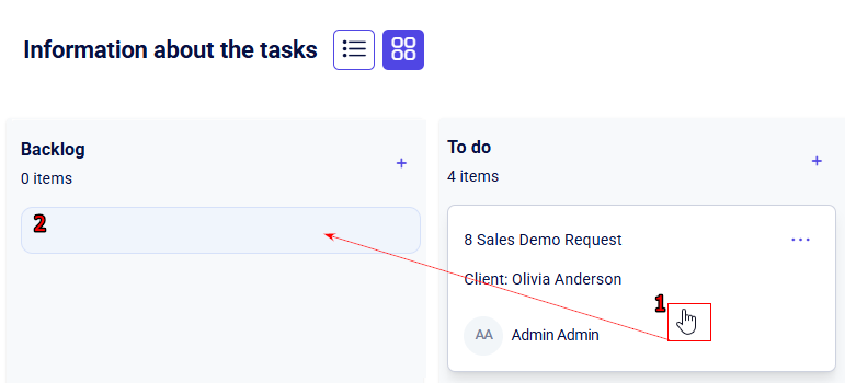 To change the task status, press and hold the card with the left mouse button and drag it to the desired column. Once a blank space appears in the new status, release the mouse button.