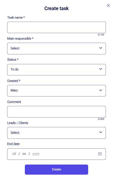 After clicking this button, a Create task pop-up window will open:
