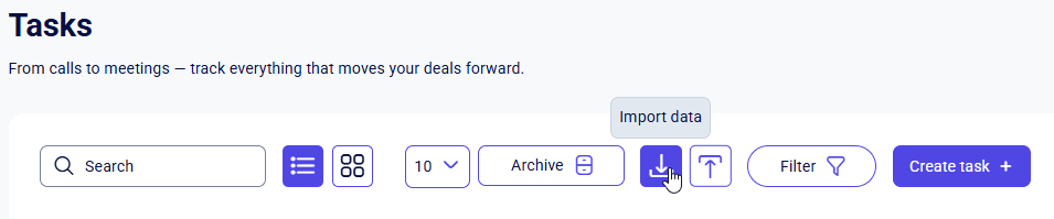 To import tasks, click the Import data button located in the List view.