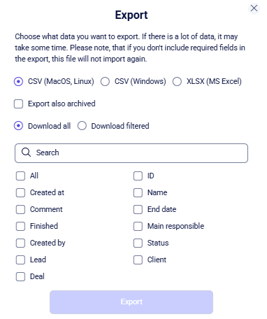 - Download all tasks or only previously filtered tasks