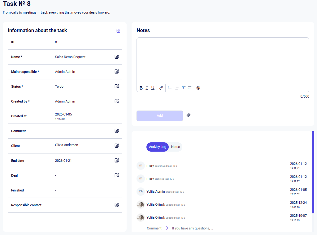 - Activity log and notes block