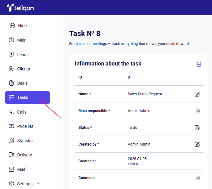 This section provides information about your project tasks in Teliqon CRM.