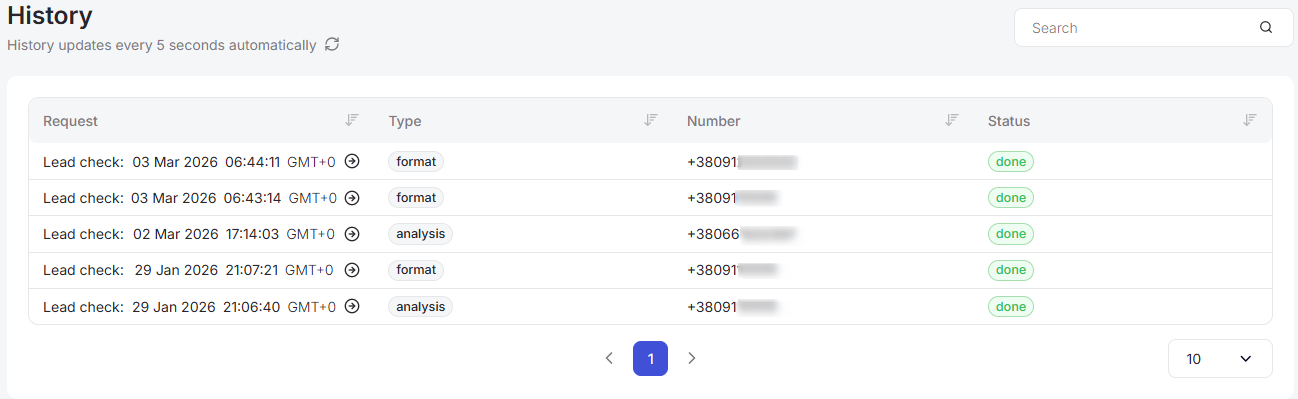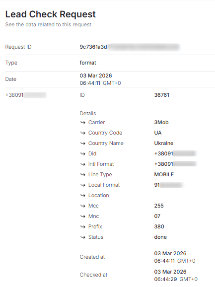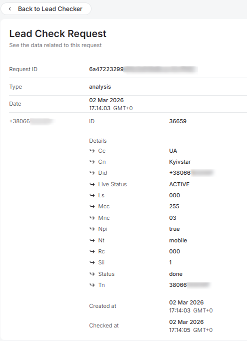 Additionally, in the Request column, clicking on the unique date of any row will open a new page with detailed information about the verified number, depending on the previously selected verification type.