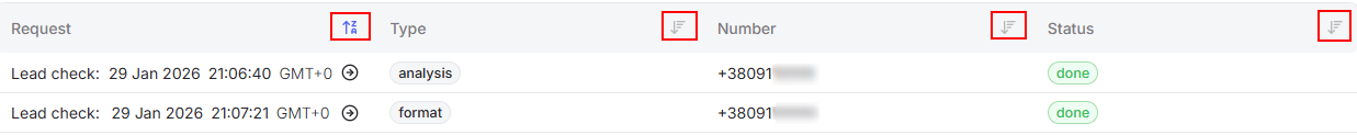 Using the quick filters in the list, you can easily sort the number verification history by any parameter, either in ascending or descending order.