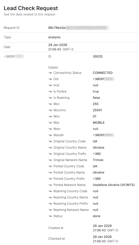 - Analysis (service cost: $0.1) - Checks the connection status of the mobile number within the cellular network;