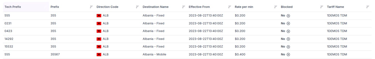 - Blocked status - the status of a specific prefix (code, sub-code) in the tariff. It may happen that certain prefixes are intentionally blocked and are specifically mentioned in the tariffs to ensure the client is aware of it. For example, in the UK (+44 country code), prefixes like 449 are often blocked because they are premium rate service (PRS) codes.