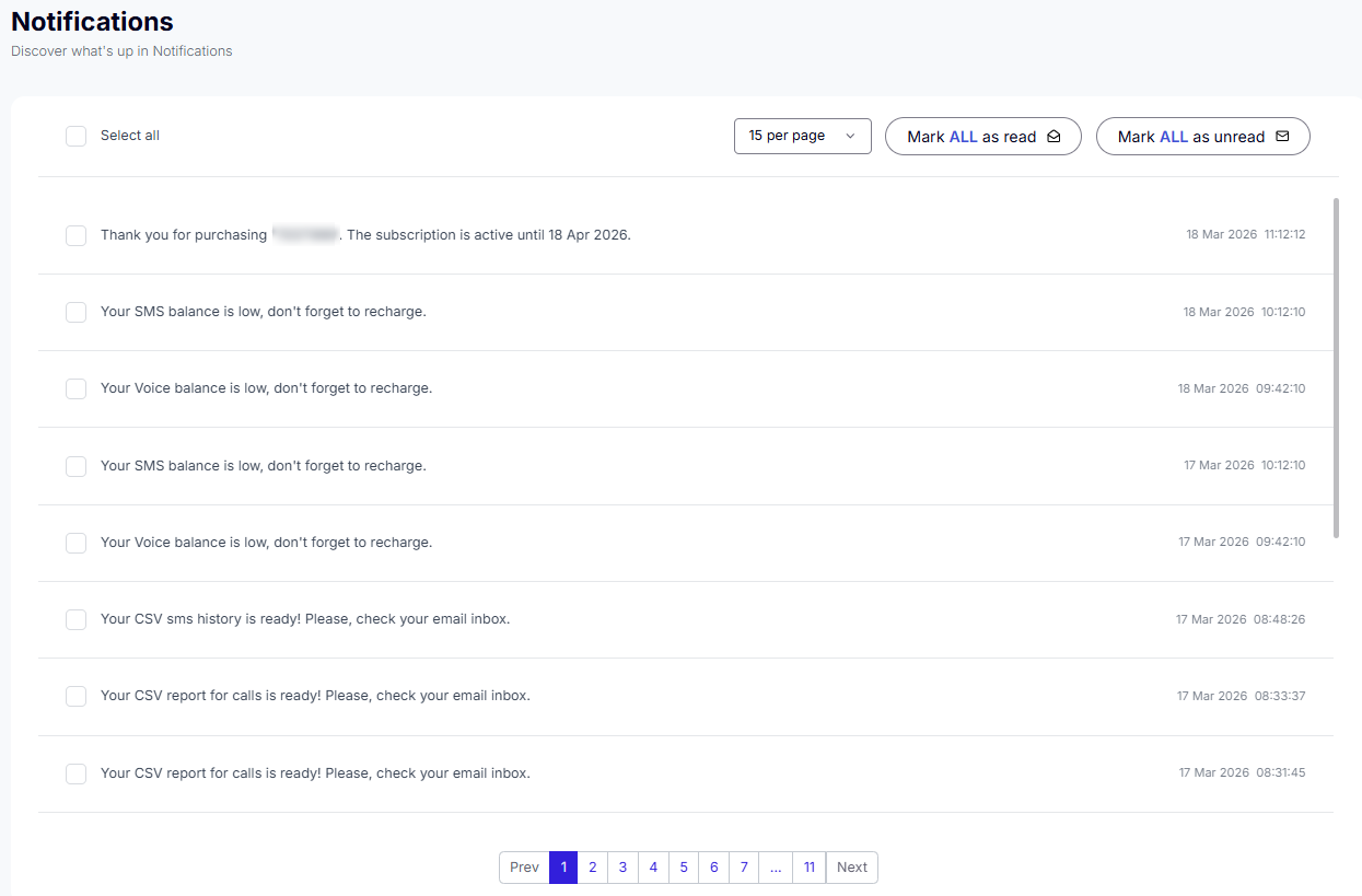 Here, you can select all entries on the page using the ‘Select All’ button, or manually choose specific notifications and perform two actions on them:
